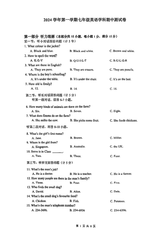 重庆市南开中学校2024-2025学年七年级上学期期中英语试题