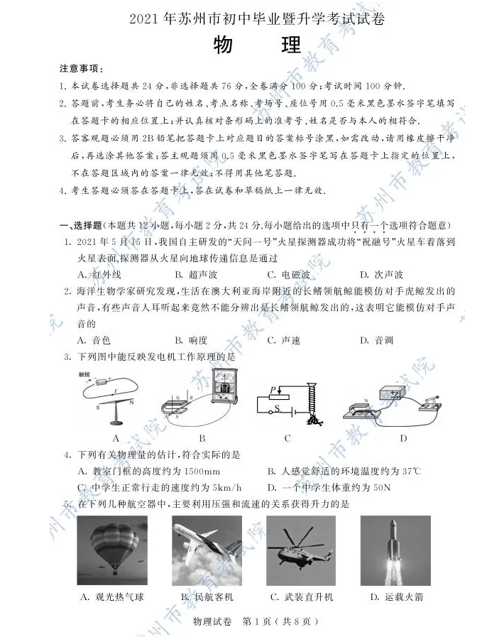 2021年江苏苏州市初中毕业生学业考试物理试题