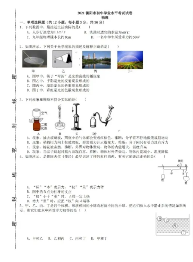 2021年湖南衡阳初中毕业生学业考试物理试题