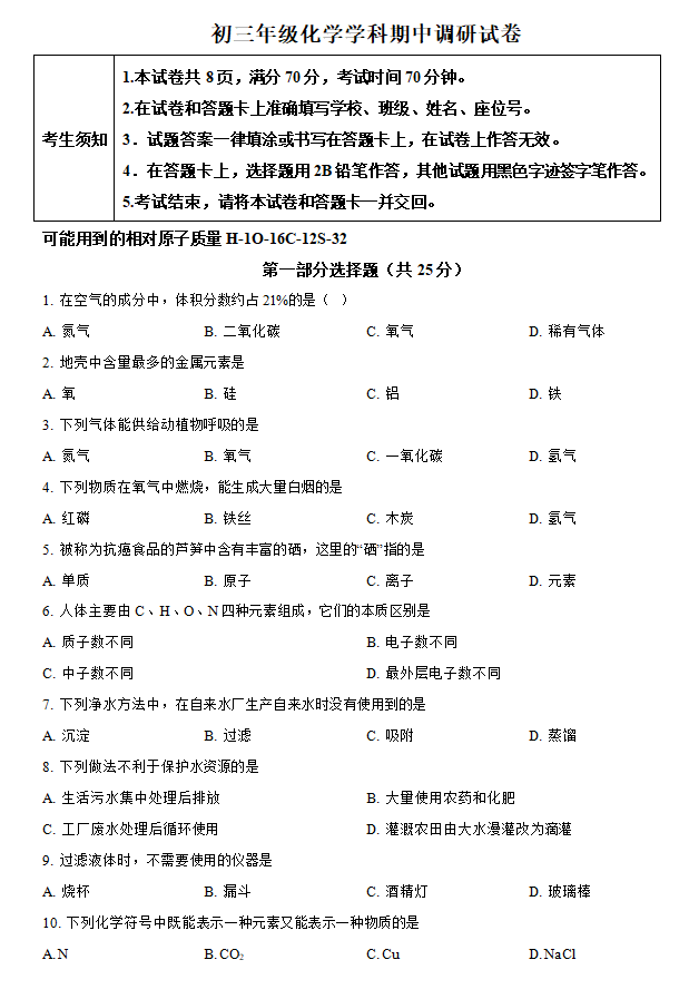 北京市朝阳区2023-2024学年九年级上学期期中化学试题