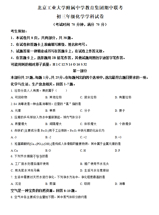 北京市朝阳区北京工业大学附属中学2023-2024学年九年级上学期期中化学试题
