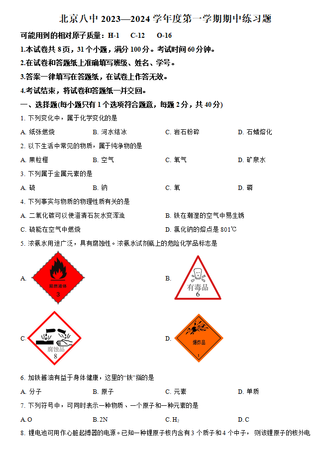 北京市第八中学2023-2024学年九年级上学期期中考试化学试卷