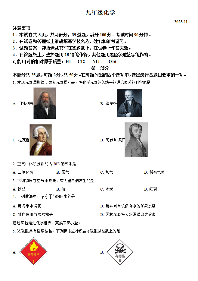 北京市海淀区2023-2024学年九年级上学期期中化学试题