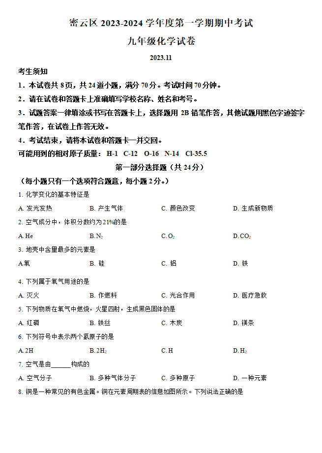 北京市密云区2023-2024学年九年级上学期期中考试化学试卷