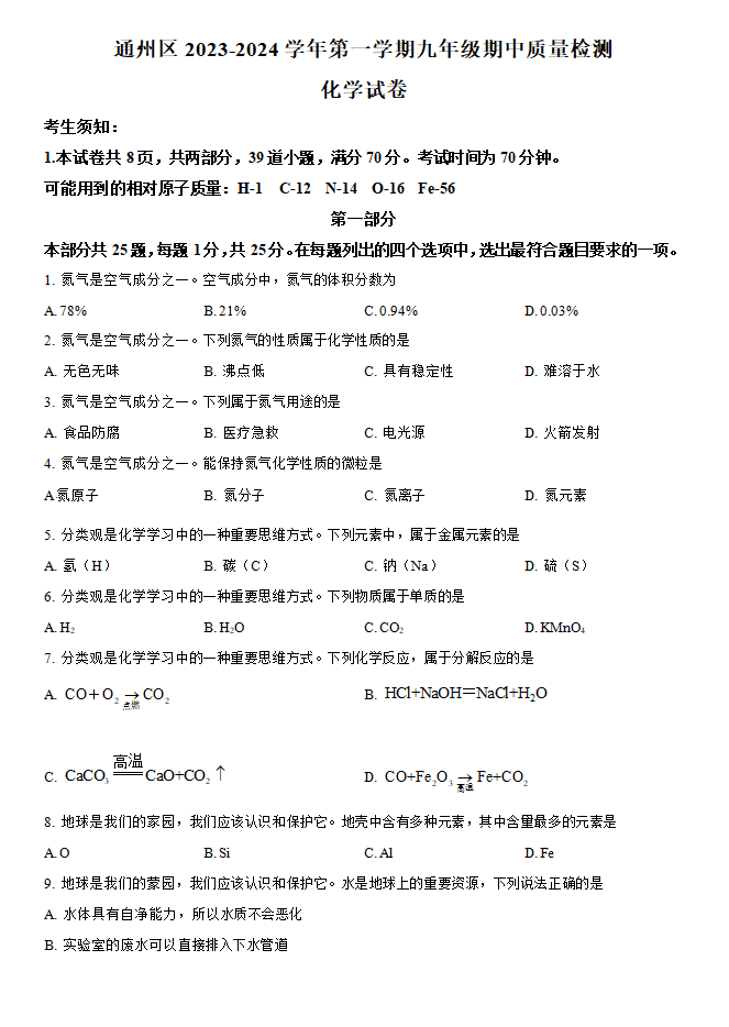 北京市通州区2023-2024学年九年级上学期期中化学试题