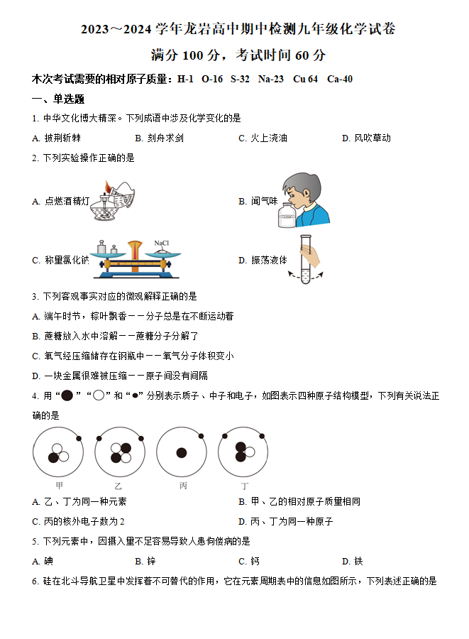 福建省龙岩市高级中学2023-2024学年九年级上学期期中化学试题