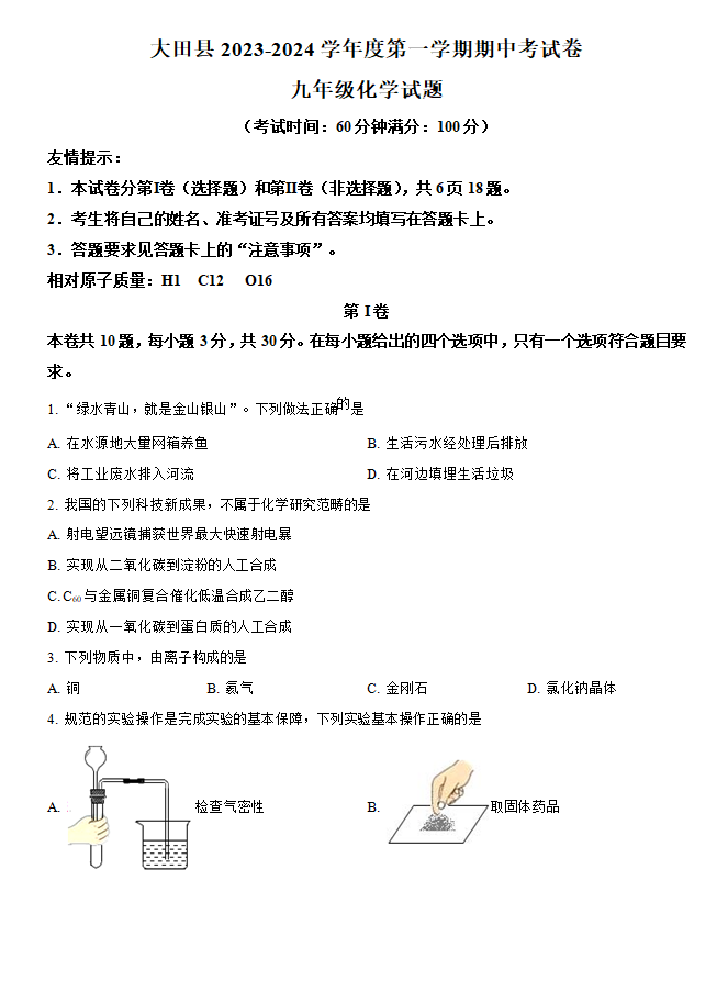福建省三明市大田县2023-2024学年九年级上学期期中化学试题