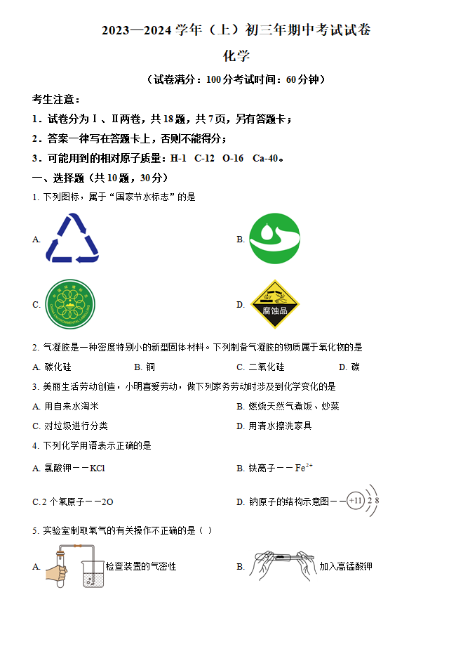 重庆市育才中学2023-2024学年九年级上学期期中考试化学试题