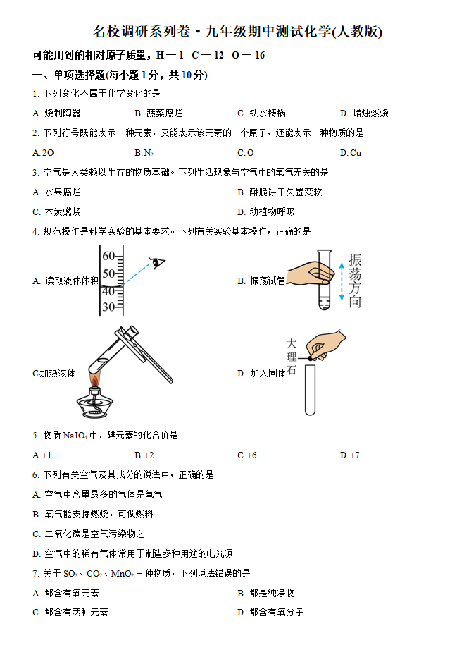 重庆市育才中学2023-2024学年九年级上学期期中考试化学试题