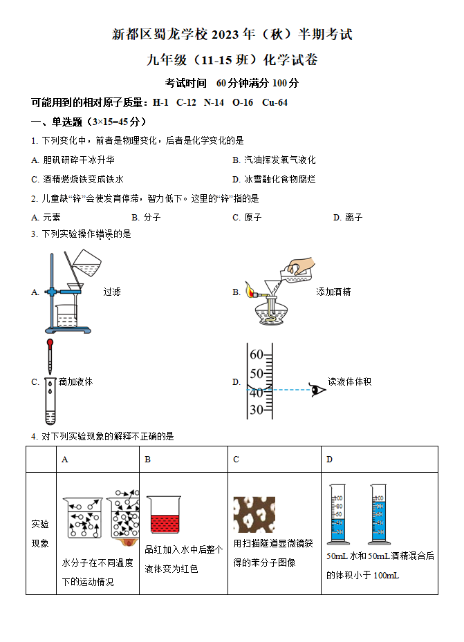 四川省成都市新都区蜀龙学校2023-2024学年九年级上学期期中化...