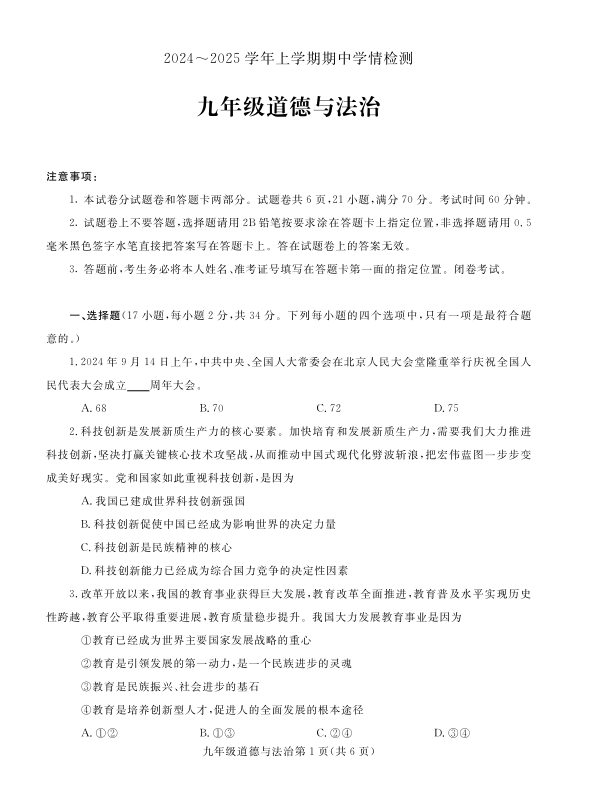 上一篇:广东省鹤山市2024-2025学年度第一学期九年级道德与法治学阶段性自查试卷
