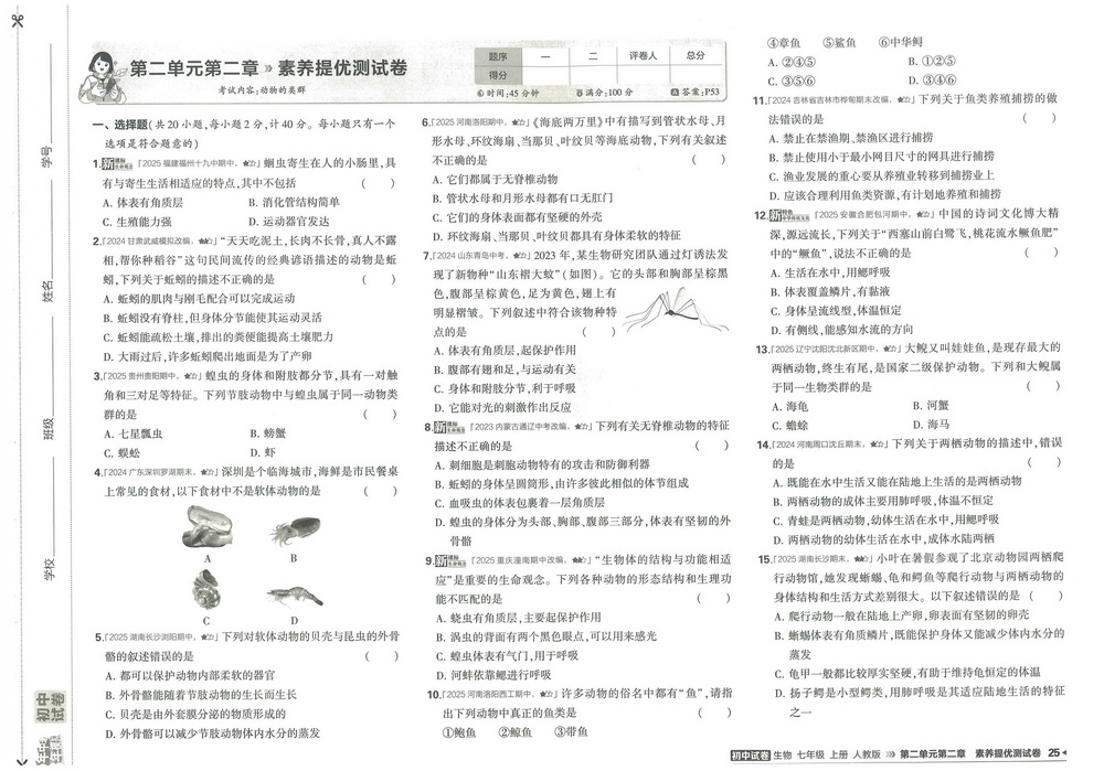 新教材人教版七年级上册生物第二单元第一、二章测试卷二