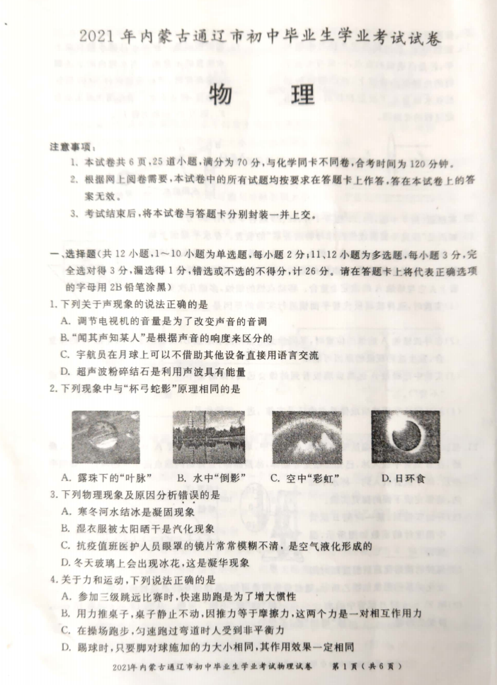 2021年内蒙古通辽初中毕业生学业考试物理试题