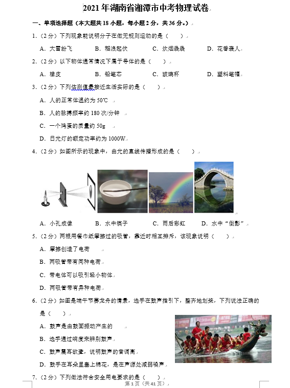 2021年湖南湘潭市初中毕业生学业考试物理试题