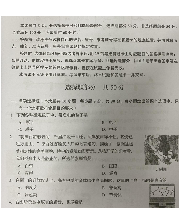 2022年贵州省铜仁市初中学业水平考试物理试卷