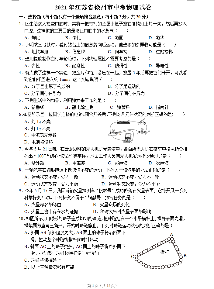 2021年江苏徐州市初中毕业生学业考试物理试题