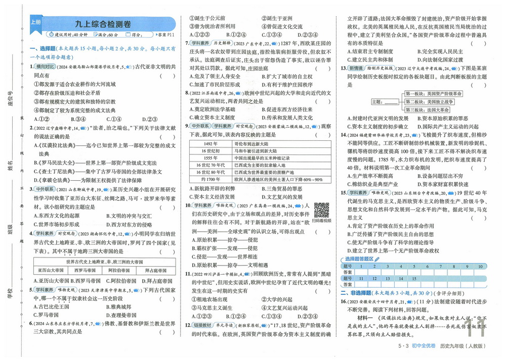 人教版九年级上册历史期末测试卷七