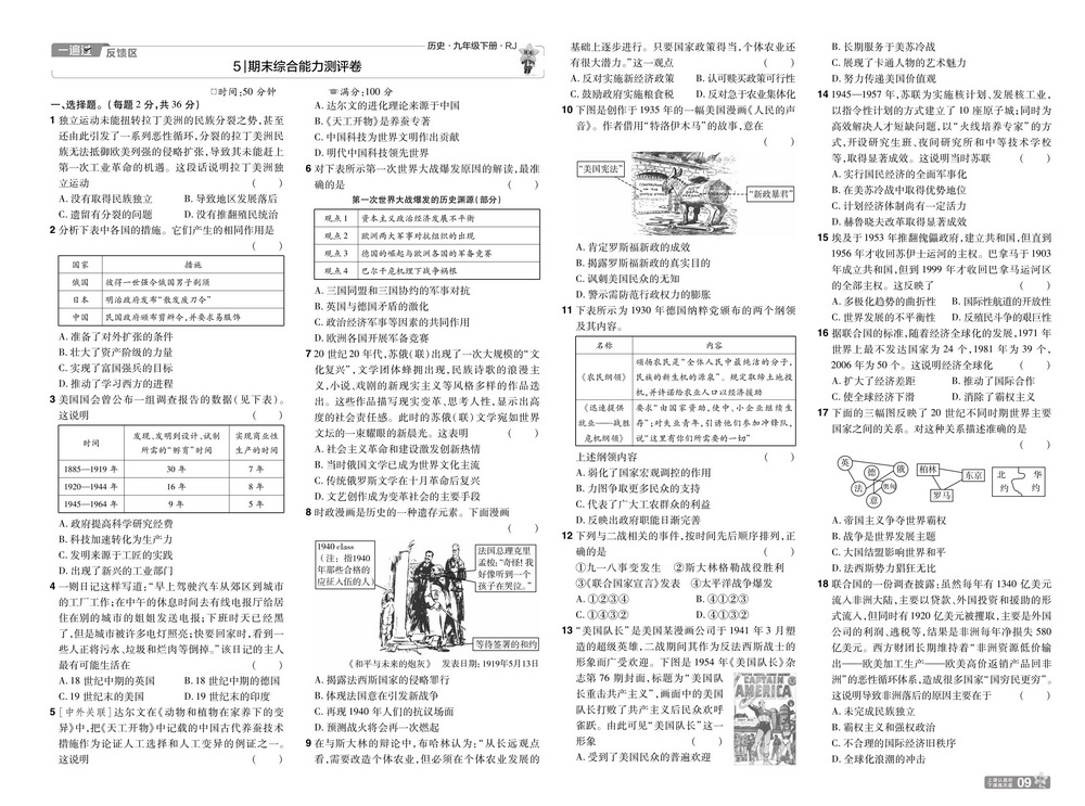 人教版九年级下册历史期末测试卷一