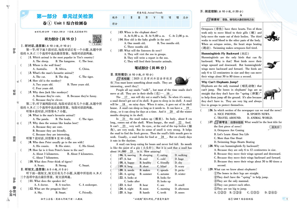 新教材人教版七年级下册英语Unit1综合测试卷七