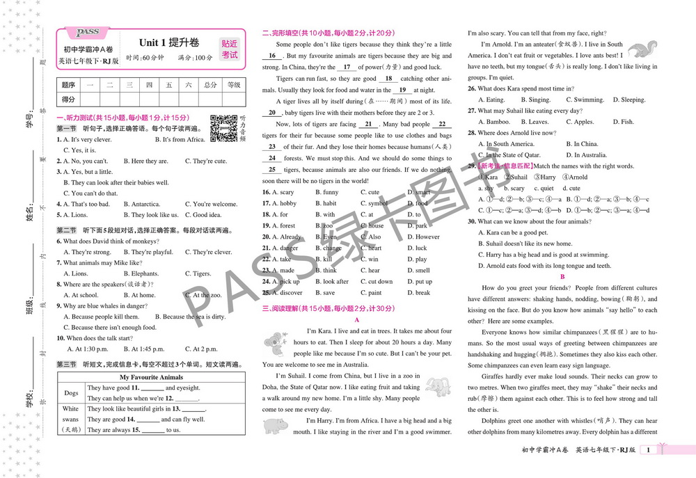 上一篇:新教材人教版七年级下册英语Unit1综合测试卷六