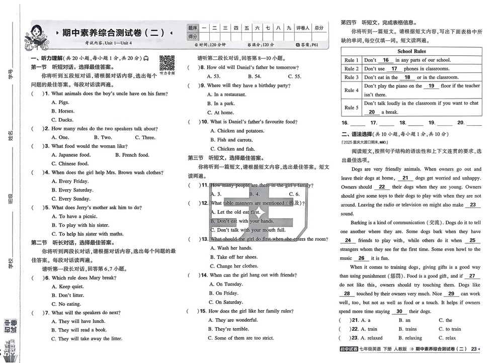 山东省德州市第五中学2024-2025学年下学期期中考试七年级英语...