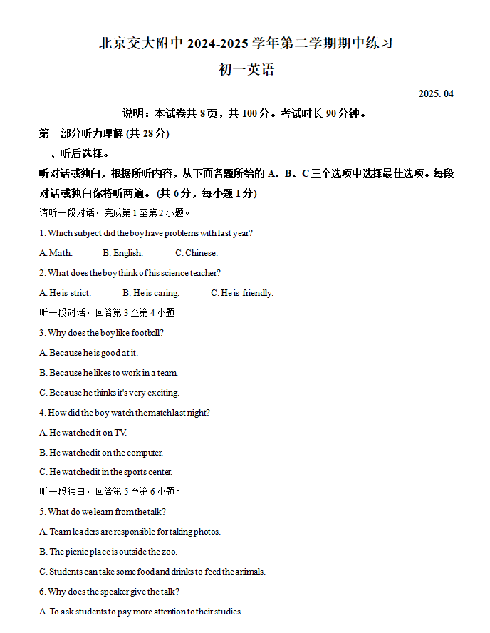 北京交通大学附属中学2024-2025学年七年级下学期期中英语试卷