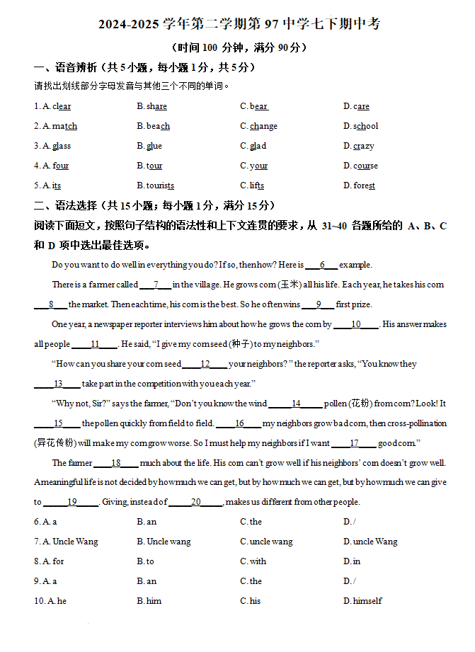 广东省广州市海珠区第九十七中学2024-2025学年七年级下学期期中英语试卷
