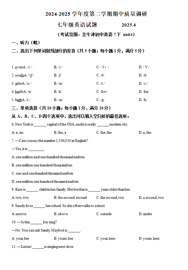 江苏省常州市2024-2025学年七年级下学期期中考试英语试卷
