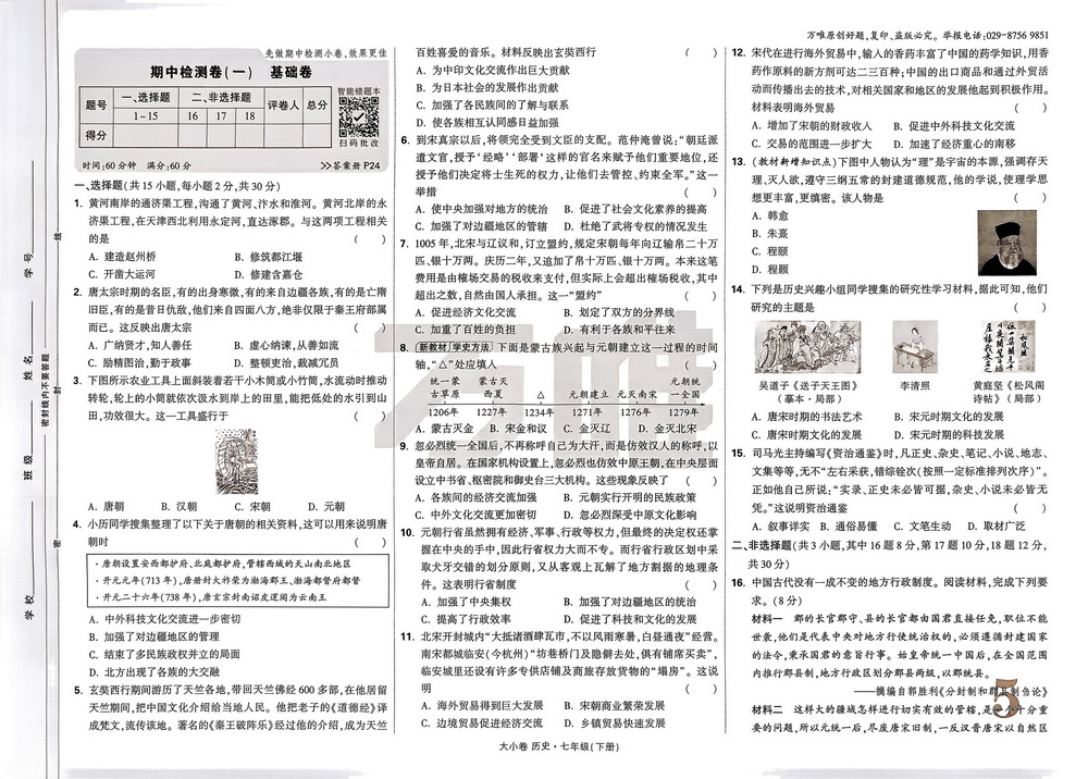 新教材人教版七年级下册历史期中测试卷五