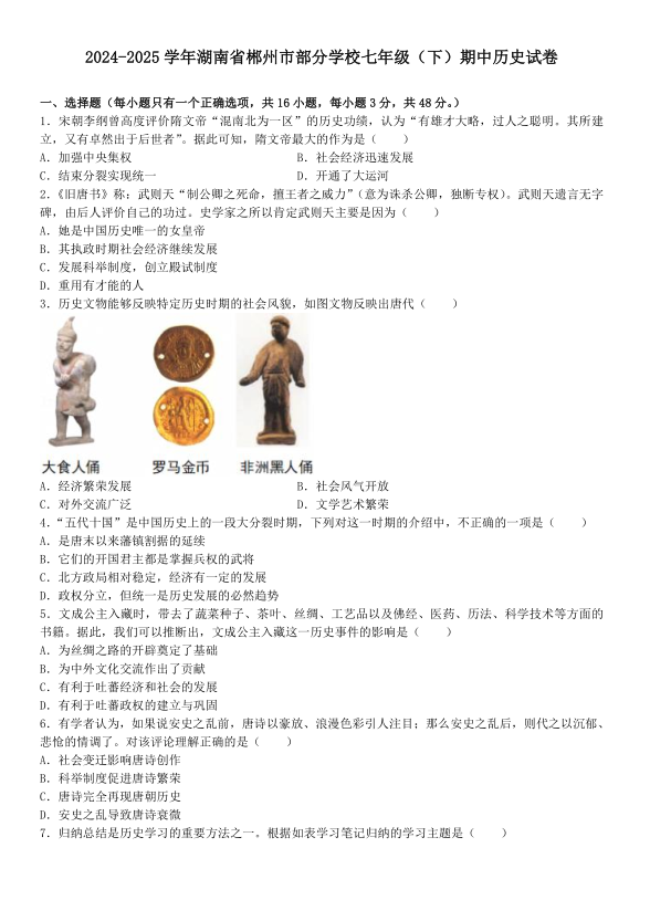 2024-2025学年湖南省郴州市部分学校七年级(下)期中历史试卷
