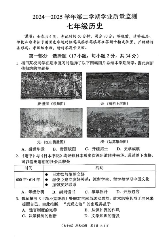 2024-2025学年广东省深圳市福田区七年级(下)期中历史试卷