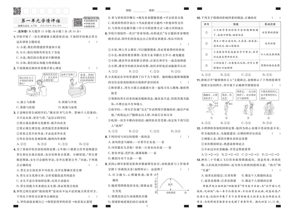 新教材人教版七年级下册道德与法治第一单元测试卷七