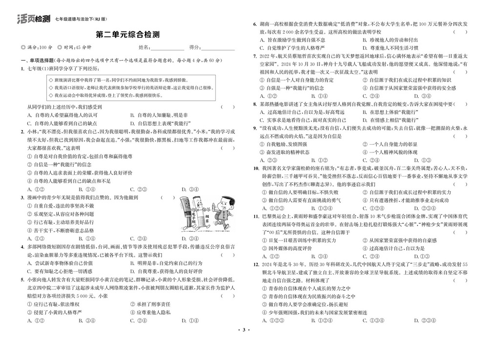 新教材人教版七年级下册道德与法治第二单元测试卷十