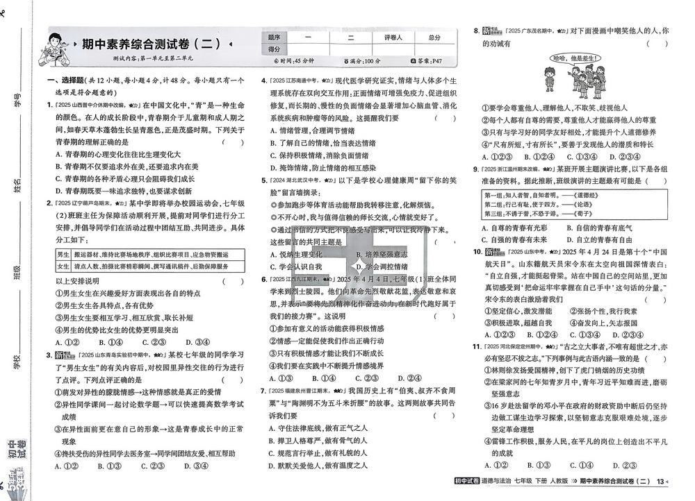 新教材人教版七年级下册道德与法治期中测试卷六