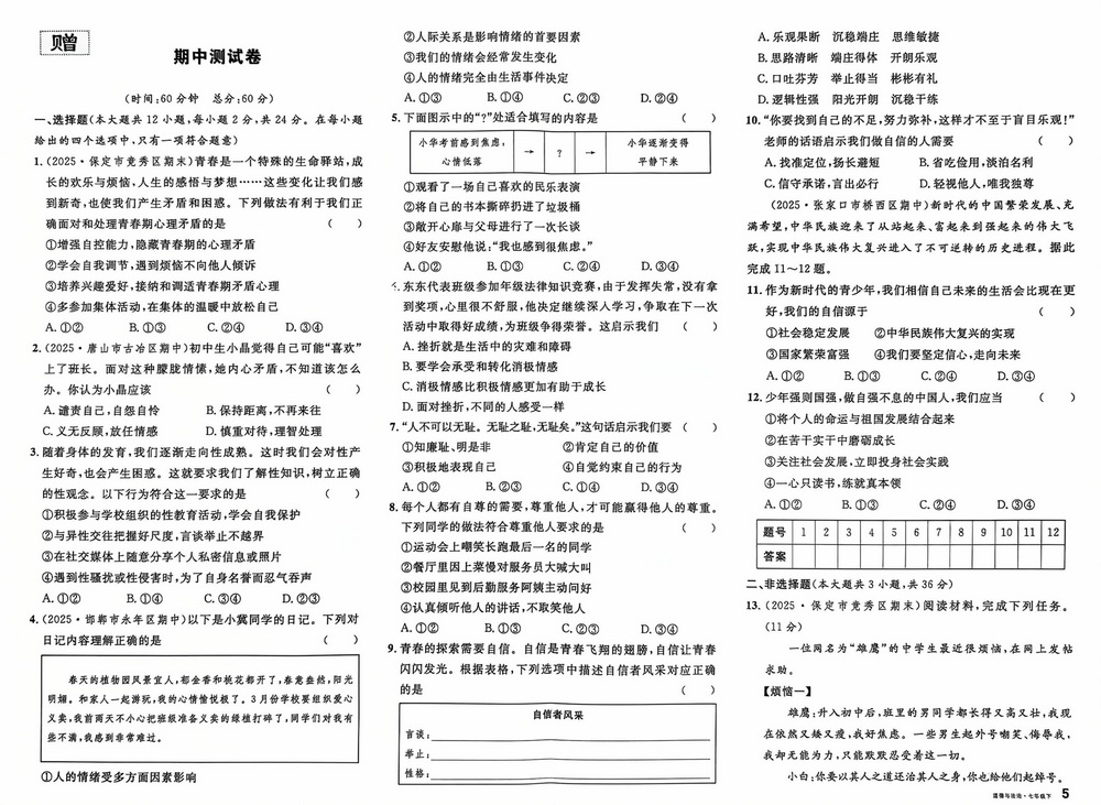 新教材人教版七年级下册道德与法治期中测试卷八