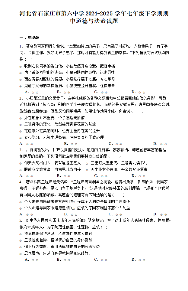 河北省石家庄市第六中学2024-2025学年七年级下学期期中道德与法治试题