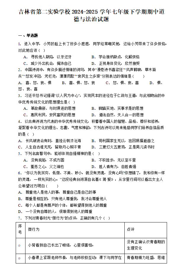 吉林省第二实验学校2024-2025学年七年级下学期期中道德与法治试题