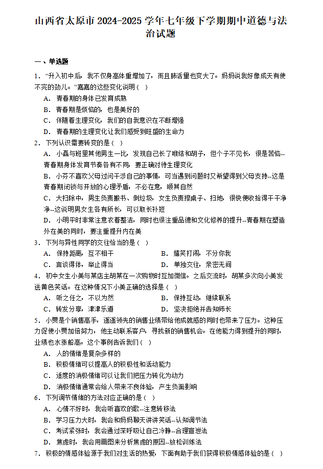 山西省太原市2024-2025学年七年级下学期期中道德与法治试题