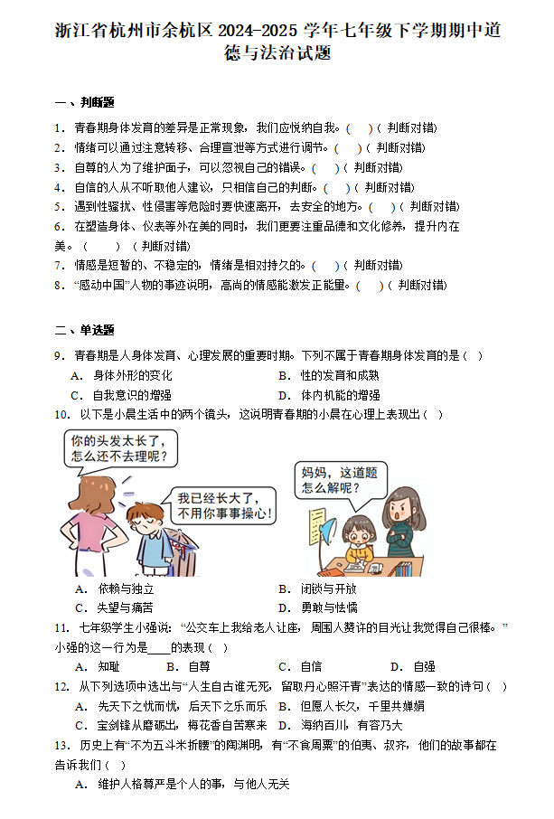 浙江省杭州市余杭区2024-2025学年七年级下学期期中道德与法治试题