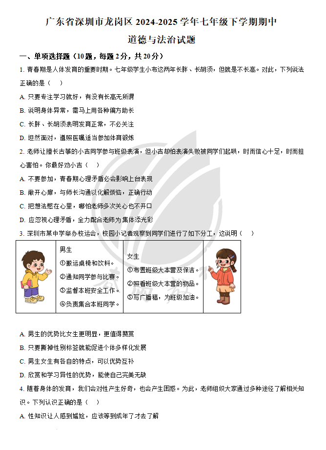 广东省深圳市龙岗区2024-2025学年七年级下学期期中道德与法治试题