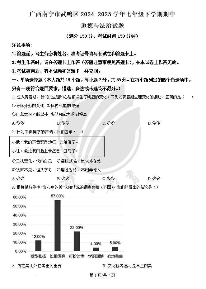 广西南宁市武鸣区2024-2025学年七年级下学期期中道德与法治试题