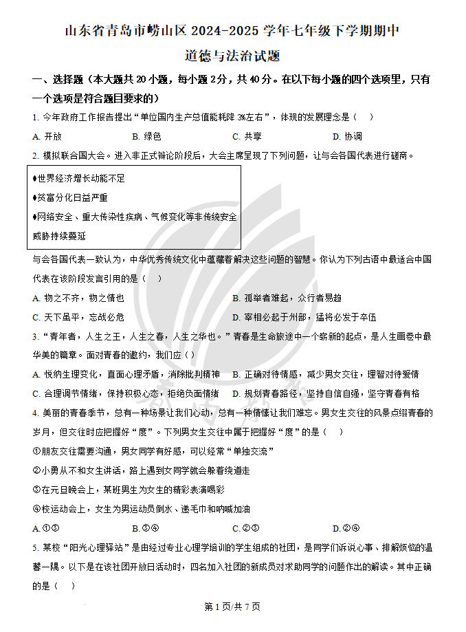山东省青岛市崂山区2024-2025学年七年级下学期期中道德与法治...