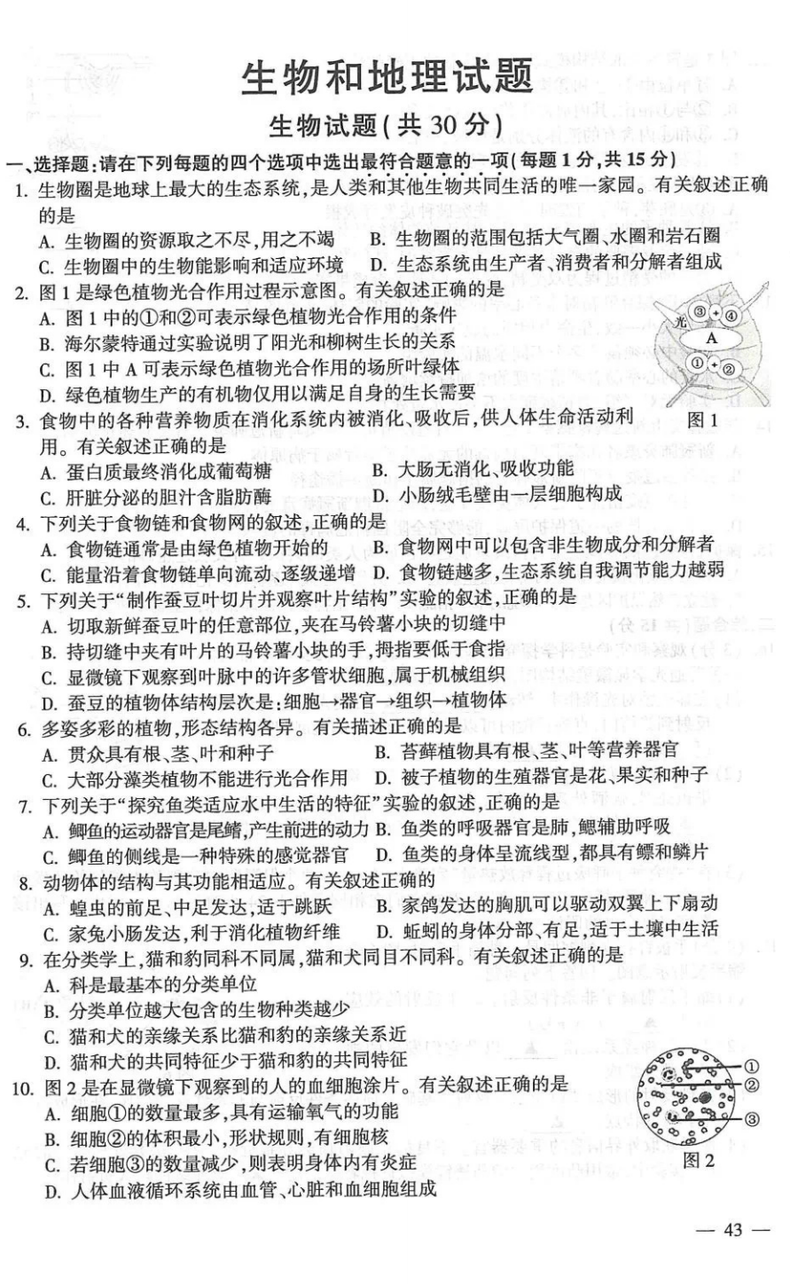 2022年山东省滨州市初中学业水平考试中考生物试卷