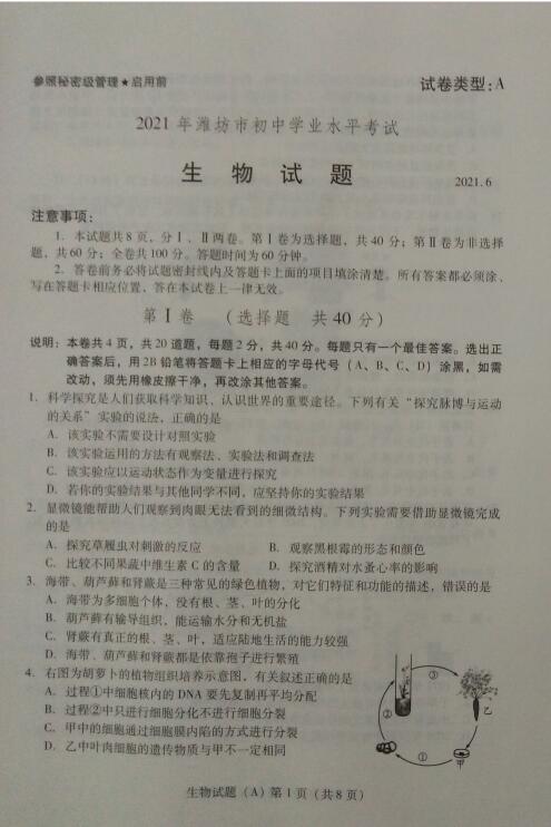2021年山东潍坊初中学业水平考试中考生物真题试卷