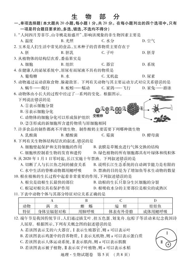 2022年山东省滨州市初中学业水平考试中考生物试卷