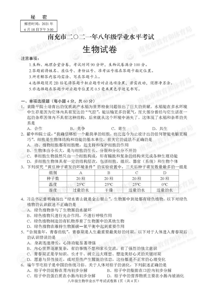 2021年四川南充初中学业水平考试中考生物真题试卷