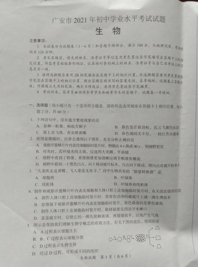 2021年四川广安初中学业水平考试中考生物真题试卷