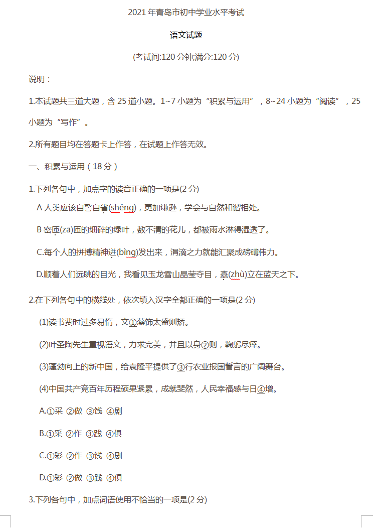 2021年山东省青岛市初中毕业学业水平考试语文试卷