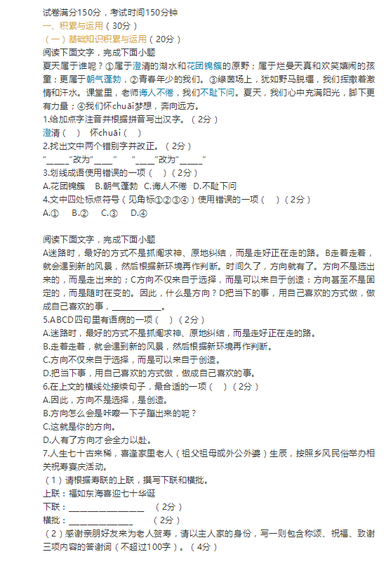 2022年贵州安顺初中毕业学业水平考试语文试卷