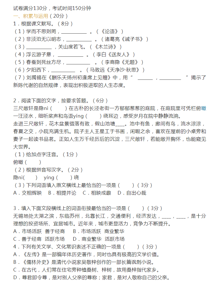 2021年江苏省无锡市初中毕业学业水平考试语文试卷